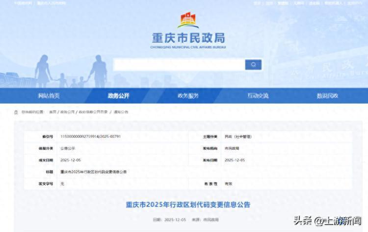重庆广电-第1眼TV消息,12月5日,重庆市民政局发布公告,两江新区正式拥有独立行政区划代码,原江北区、渝北区相关区域代码同步废止。这些变更与你我的户口、社保、孩子入学,甚至快递地址都息息相关。