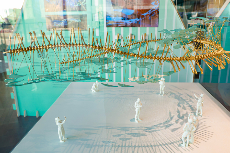 展厅现场,可以看到艺术家杨冬白为北广场设计的雕塑《极目天舒》的小样。这一作品取意于“层峦叠嶂”,以抽象化的雕塑语言形成城市文脉和自然山水交织的艺术空间,也与上博东馆主体建筑“水”的意蕴和上海城市精神呼应。美国艺术家马修·盖勒则为南广场量身设计了高8米的中型雕塑作品《粉云梅影》,其灵感来源于上海博物馆的标识,并借鉴了中国传统的飞檐翘角和梅花意象,作品的色彩还会随着天气和太阳位置的变化而变化。上海米丘环境艺术设计有限公司为一楼东北角书香咖啡区上空设计了一件名为《竹书纪年·夸父女娲后裔》的艺术装置。作品运用中国传统的材料工艺,如竹、瓷、金等,将远古神话场景进行具象和抽象的结合。在展厅中,如果从某个特定的角度观看作品小样,还能看到留白处是“后羿射日”的景象。